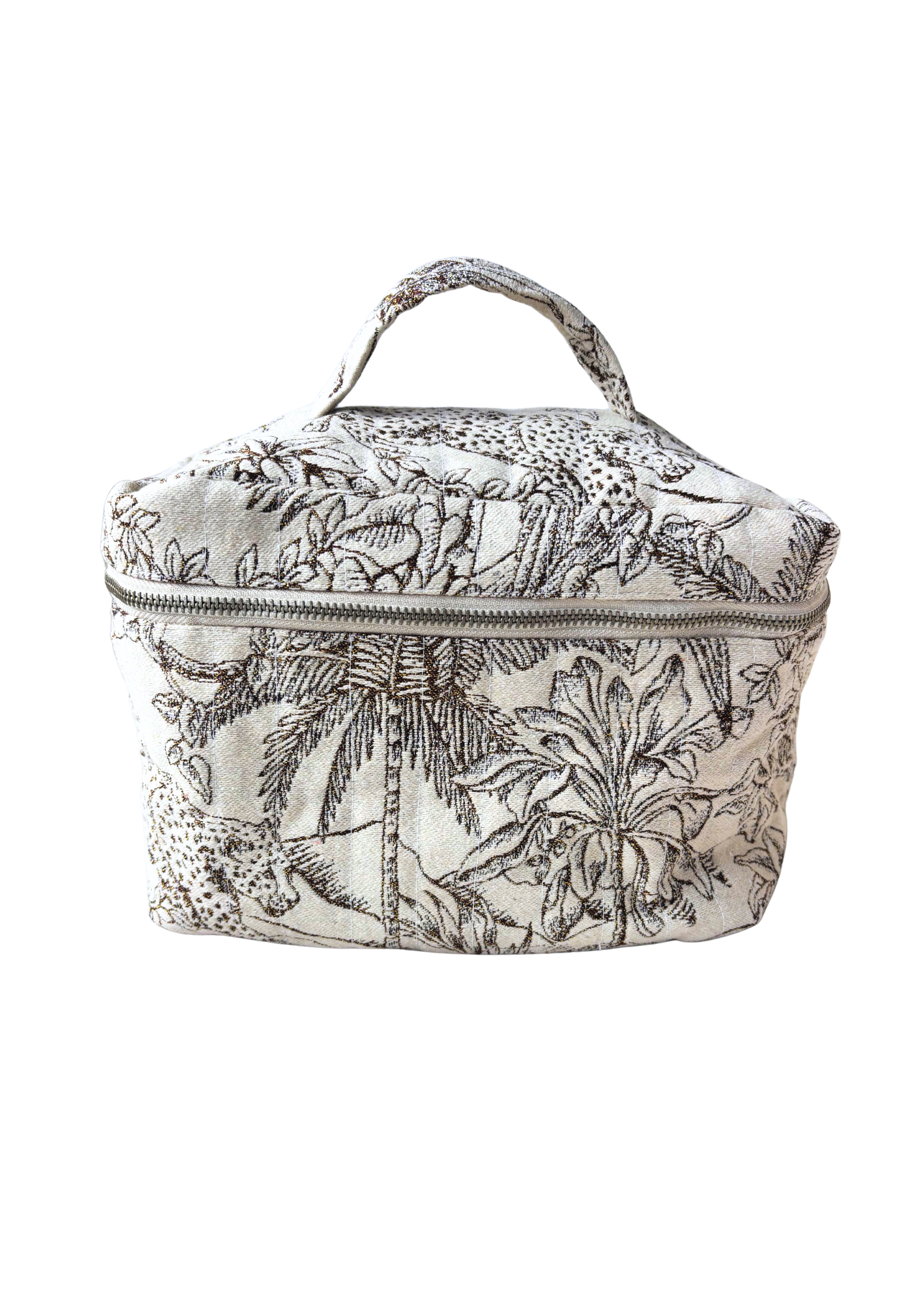 The sturdy, lined fabric and practical size make it perfect for storing your favorite toiletries, makeup, or travel essentials. With its timeless color palette and refined pattern, this toiletry bag complements any style, a subtle blend of simplicity and elegance.
